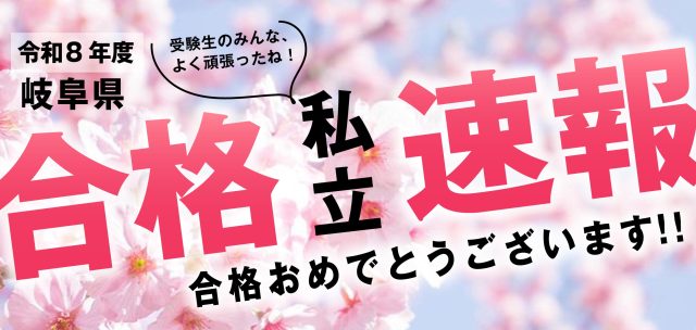 お知らせ 2026.02.06 令和8年度至知ゼミナール塾生私立高校 岐阜校舎合格実績! 至知ゼミ受験生の私立高校、岐阜校舎合格実績をお届けします!! 受験生の皆さん!本当によく頑張りました!! 合格おめでとうございます! 至知ゼミナール/岐阜校舎合格速報 👑国立岐阜工業高等専門学校(機械工学科)1名 👑大垣日大高等学校(総合進学) 4名 👑大垣日大高等学校(アカデミー 奨学生) 1名 👑岐阜東高等学校(進学コース) 2名 👑岐阜東高等学校(蛍雪コース) 1名 ・済美高等学校(特進)1名 ・済美高等学校(選抜特進)2名 ・済美高等学校(総合進学)3名 ・済美高等学校(商業)2名 ・岐阜聖徳学園高等学校(1類)1名 ・岐阜聖徳学園高等学校(2類)3名 ・岐阜聖徳学園高等学校(商業)1名 ・冨田高等学校(普通)1名 ・岐阜女子高等学校(一般)1名 ・岐阜第一高等学校(自動車エンジニア)1名 一覧に戻る